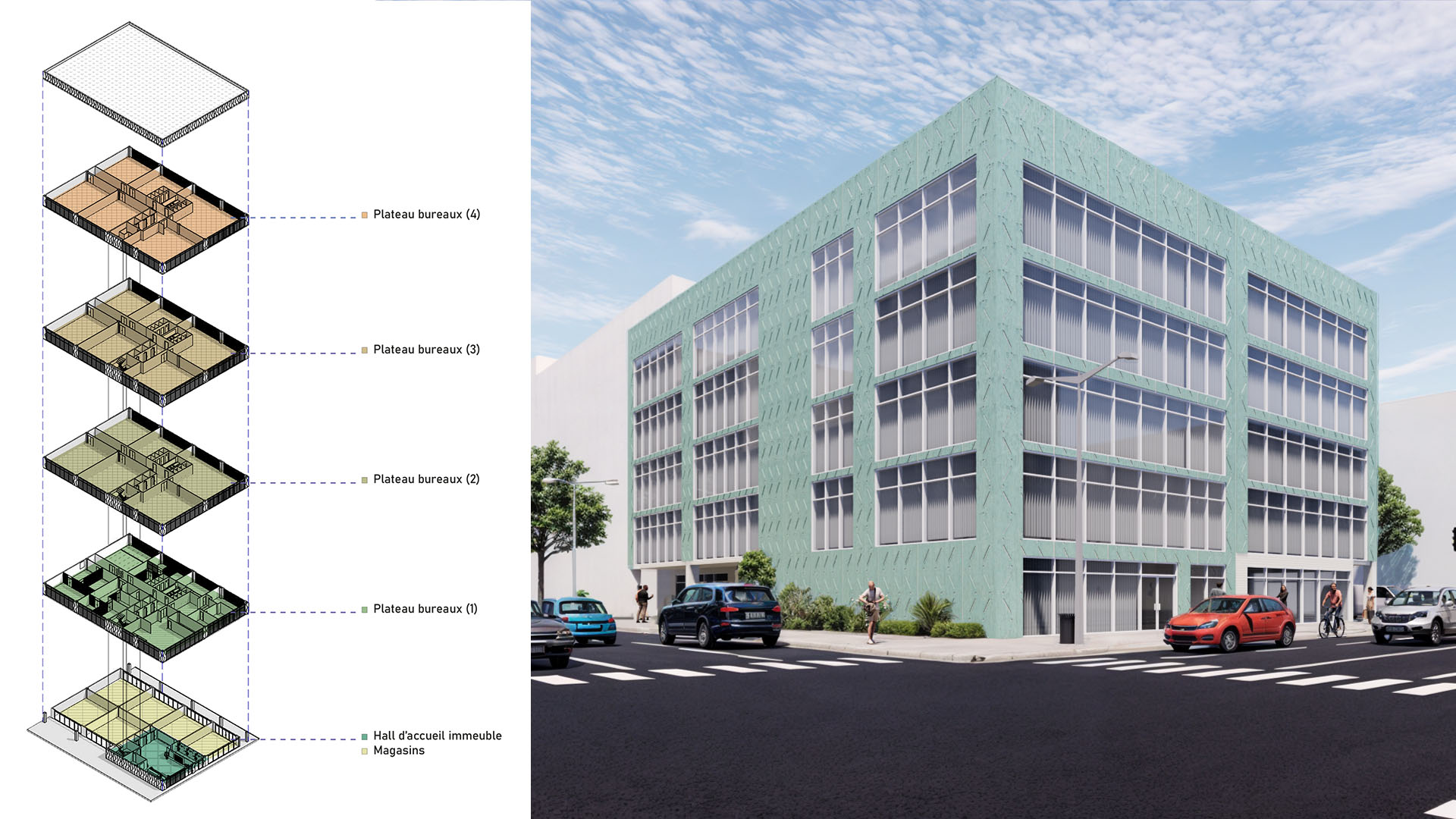 Cet immeuble de bureaux contemporain s’étend sur quatre étages et compte six magasins au rez-de-chaussée, offrant un espace commercial animé. Chaque étage est aménagé de manière à optimiser l’espace de travail grâce à des bureaux spacieux et modulables. Les larges fenêtres donnent aux espaces de la lumière naturelle, créant un cadre de travail agréable. Les façades sont habillées de cuivre patiné « vert-de-gris », ce qui contraste avec l’environnement et permet au bâtiment de se démarquer tout en s’intégrant dans le paysage urbain qui l’entoure.