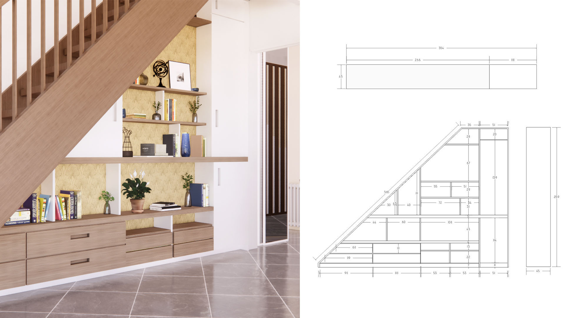 (3) Conception d’une bibliothèque sur-mesure pour une salle à manger. Elle s’intègre sous l’escalier et dispose de vastes espaces de stockage pour les livres et des compartiments pour les objets décoratifs.