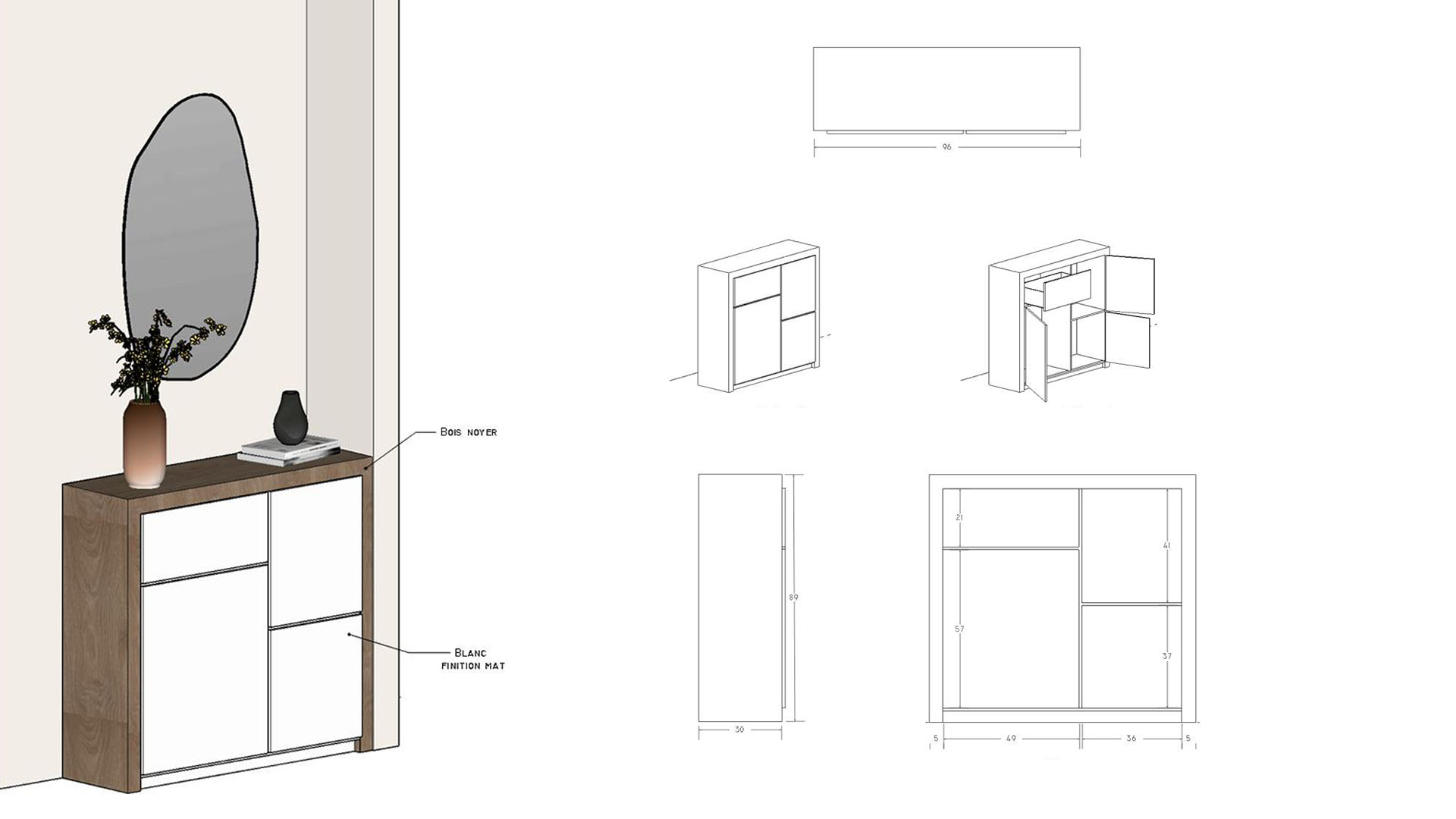 (2) Conception d’un meuble d’entrée épurée et moderne contient différents compartiments de rangement. Les portes battantes dissimulent des étagères ainsi qu’un tiroir supérieur pratique pour les petits objets du quotidien.